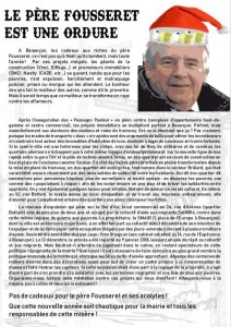 A Besançon, les cadeaux aux riches du père Fousseret, ce n’est pas qu’à Noël qu’ils tombent, mais toute l’année ! Par ses projets mégalo, les géants de la construction (Vinci, Eiffage…) et promoteurs immobiliers (SMCI, Nexity, ICADE, etc…) se gavent, tandis que pour les pauvres, c’est expulsion, harcèlement et matraquage policier, prison ou morgue qui les attendent. Le bonheur des uns fait le malheur des autres, comme dit le proverbe. Mais il serait temps que ce malheur se transforme en rage contre les affameurs.