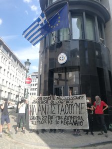 . Cet après-midi, devant l’ambassade grecque à Bruxelles, banderole de solidarité avec la résistance anarchiste à Exarcheia !