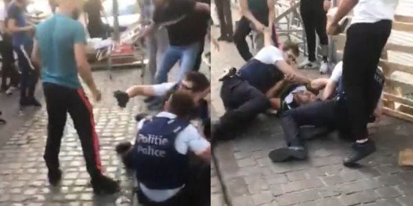 La vidéo mise en ligne par le syndicat libéral de la police (SLFP) (voir la capture d’écran ci-dessous, faite par la Libre) montre deux à trois policiers qui ont maîtrisé un homme ainsi que des passants qui tentent de soustraire cet homme à l’emprise des policiers.