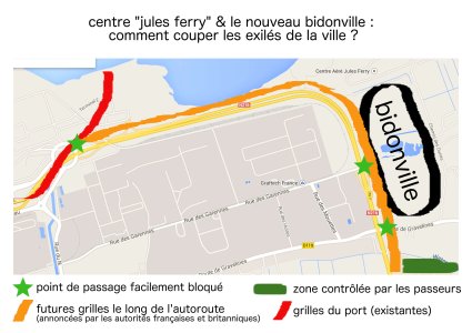 Les autorités ont informé les habitants des jungles et squats qu’ils doivent « déménager » sur un site qui est une ancienne décharge, fait de zones humides et situé à environ 7 km en dehors de Calais (note 1), ou faire face à des expulsions forcées une fois de plus. Peu d’entre eux considèrent cela comme un choix. Le site lui-même manque de toute installation pour la vie quotidienne, et va créer un ghetto de personnes qui, actuellement, vivent dans leurs propres communautés organisées. Cette perspective soulève ainsi des craintes parmi eux de conflits entre communautés. D’autre part, cela va déplacer les migrants dans une zone hors de la ville contrôlée par la mafia. Ce nouveau campement apparaît donc comme une étape supplémentaire vers l’apartheid des migrants hors de la ville et hors de la vue, au cœur de l’Europe.
