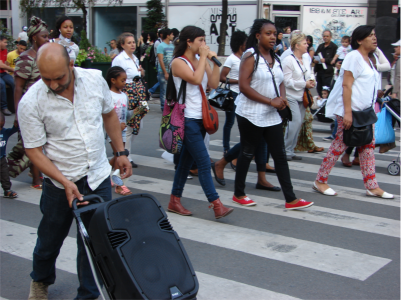 Environ 70 personnes étaient au rdv. Surtout des femmes, avec et sans papiers mais aussi des hommes, avec et sans papiers. Les tambours attiraient beaucoup de monde, malheureusement la police avait expliqué aux femmes qu’elles ne pouvaient pas amener leur banderole. Du coup de loin ce n’était pas très clair de quoi il s’agissait. Le rôle de la police c’est le maintien de l’ordre, interdire le port de banderoles est clairement une démarche politique.